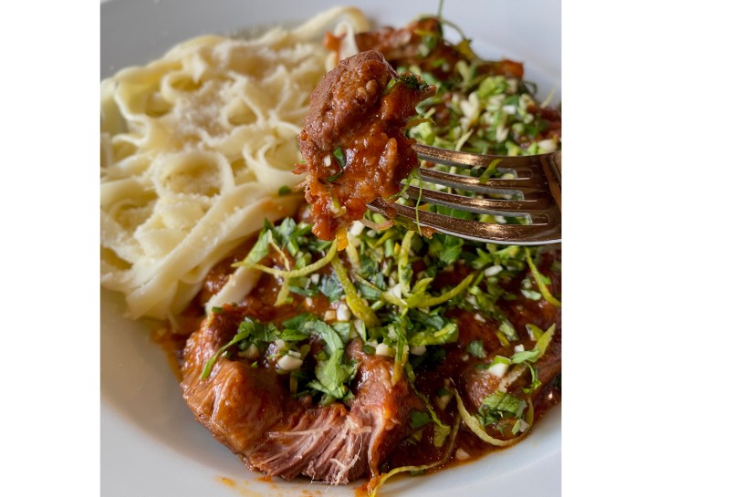 Ossobuco hecho en la salsa pomodoro de La Divina Comida, terminado con gremolata, servido con fettuccine a la mantequilla.